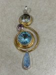 Sterling SIlver 22K Gold Vermeil faceted Sky Blue Topaz, Green Amethyst, Pink Topaz and Opal Swirl Pendant by Michou