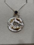 Sterling Silver and 22K gold vermeil cabochon Iolite round faceted blue topaz 25mm fish circle pendant by Michou.